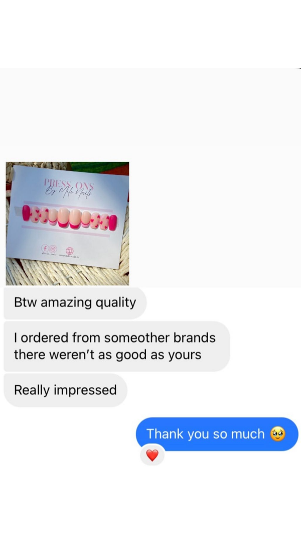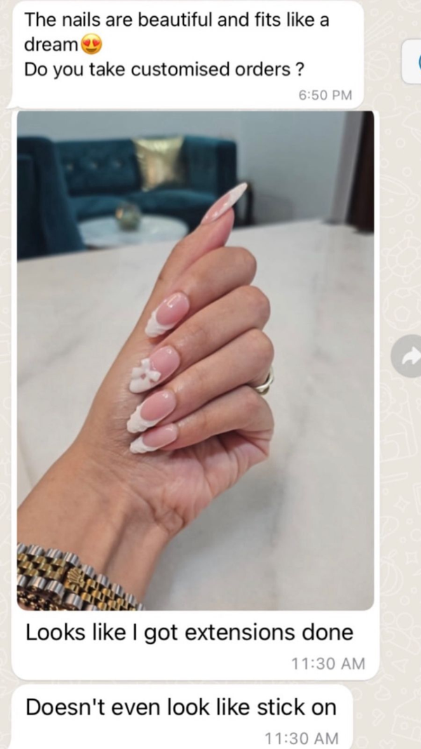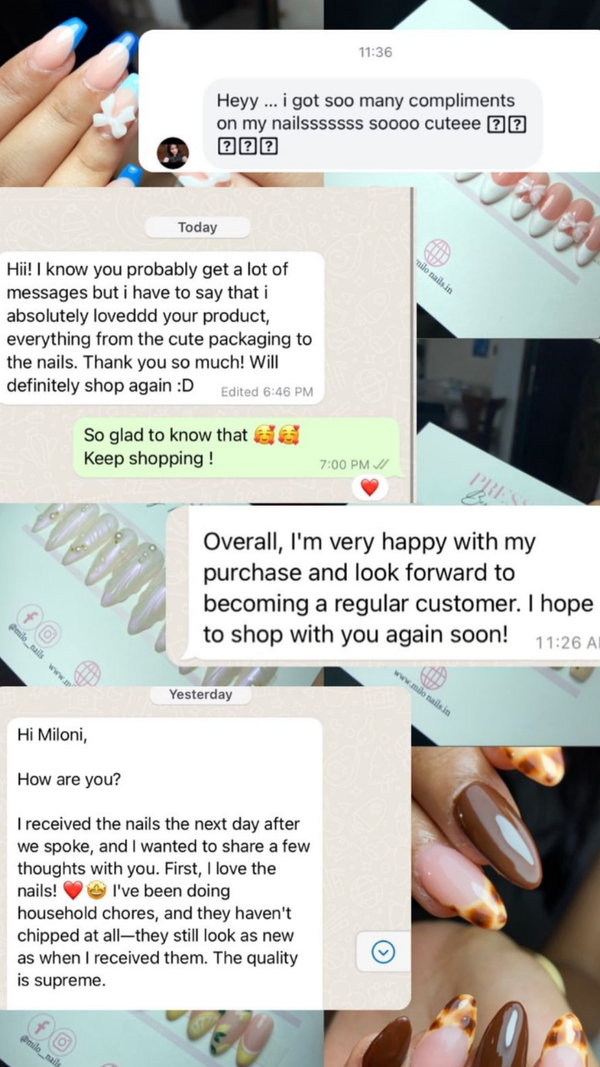 As our nails are customised and handmade, we do not accept returns. Exchanges are only provided for damaged or defective products, reported within 24 hours of delivery with an unboxing video.