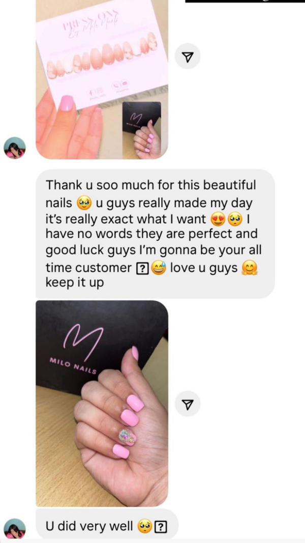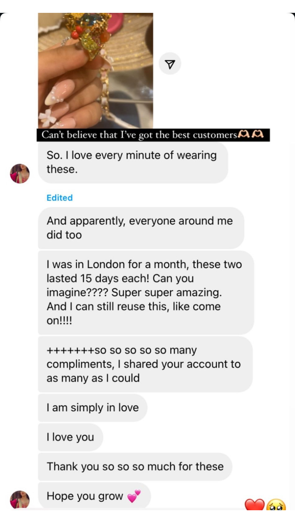 With proper application and care, our nails can last up to 2–4 weeks. We also provide a high-quality glue formulated for strong, long-lasting adhesion.